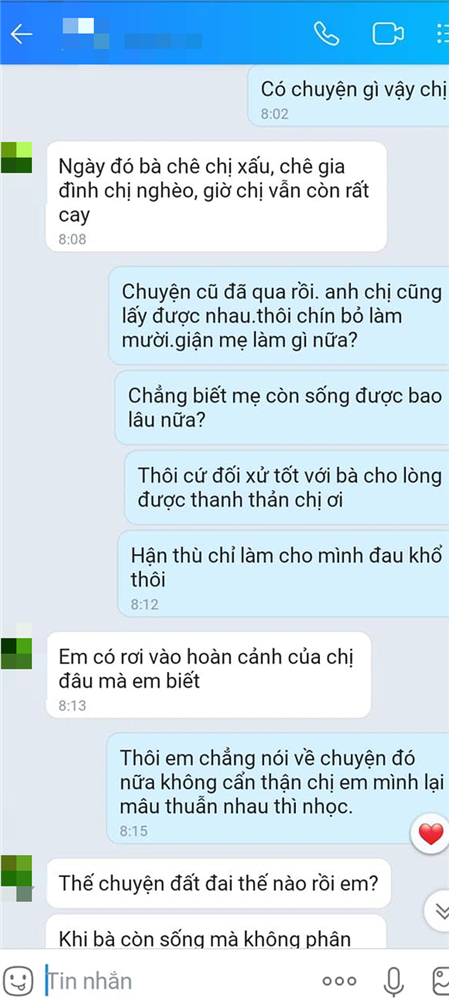 Nhưng vài năm nay, sức khỏe bà ngày càng yếu, tháng nào cũng đi viện và chỉ có vợ chồng tôi ở bên cạnh phục vụ. Thậm chí tôi còn lấy hết tiền tiết kiệm ra chữa bệnh cho mẹ chồng. Chính vì sự quan tâm không tính toán thiệt hơn của tôi, đã khiến mẹ chồng động lòng.