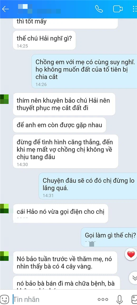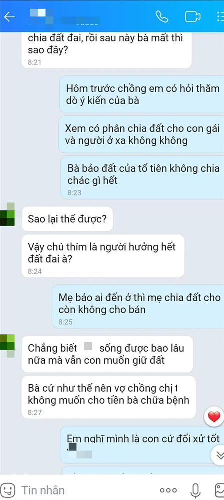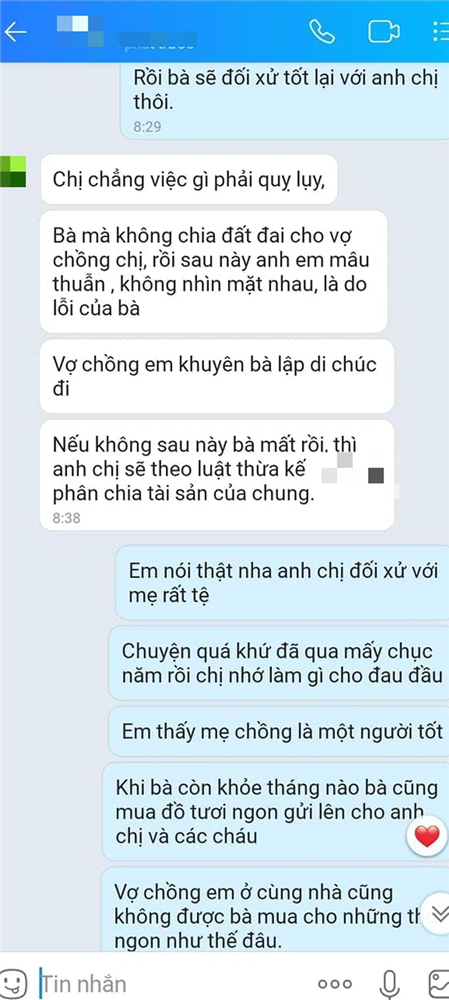 Bà đã cho tôi 4 cây vàng và định sang tên sổ đỏ 300m2 đất cho vợ chồng tôi. Nhưng chị dâu tôi rất tham lam, chị ấy đang tạo sức ép, bắt mẹ chồng phải chia tài sản. Trong khi đó chưa bao giờ chăm sóc mẹ chồng được một ngày.