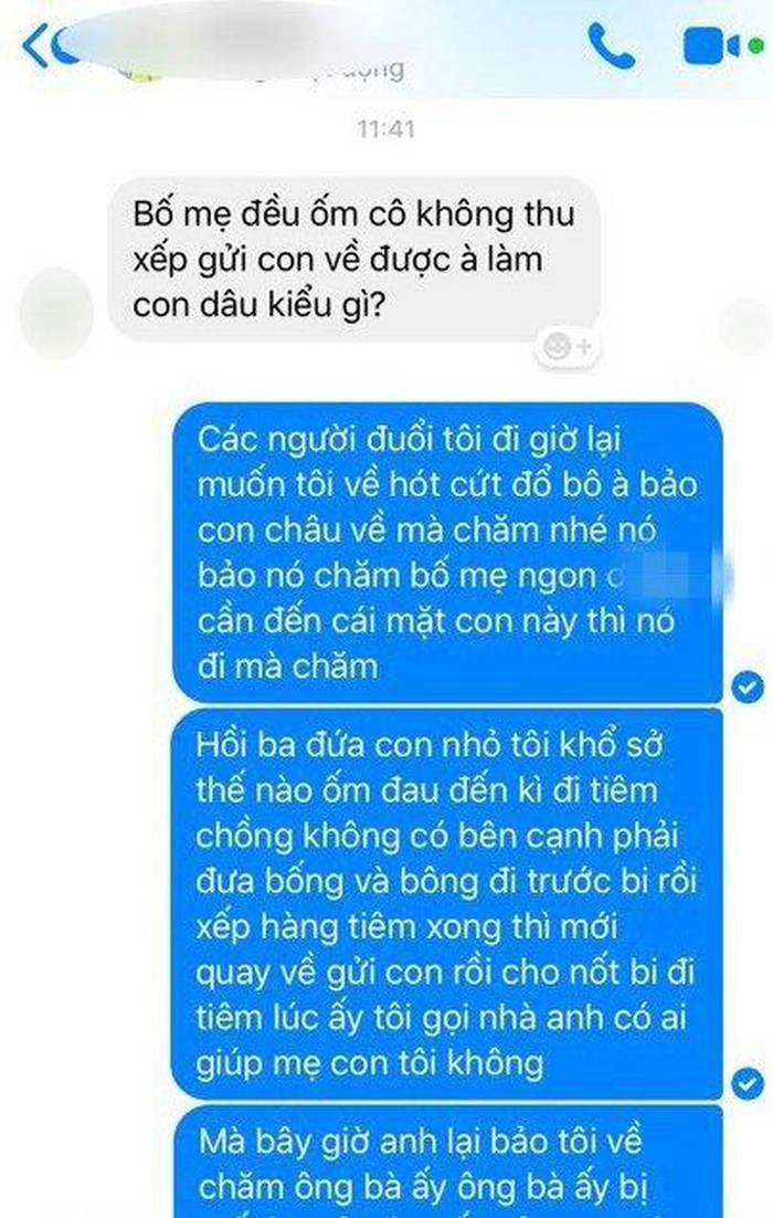 Nghĩ đến việc ngày trước bị hắt hủi, không ai đỡ đần, cô vợ bức xúc không muốn về và cũng không muốn chăm sóc bố mẹ chồng, cô nói chồng gọi em gái về mà chăm. Thế nên 2 vợ chồng đã cãi vã om sòm, còn nhắn tin qua lại và chồng thì đòi ly hôn.