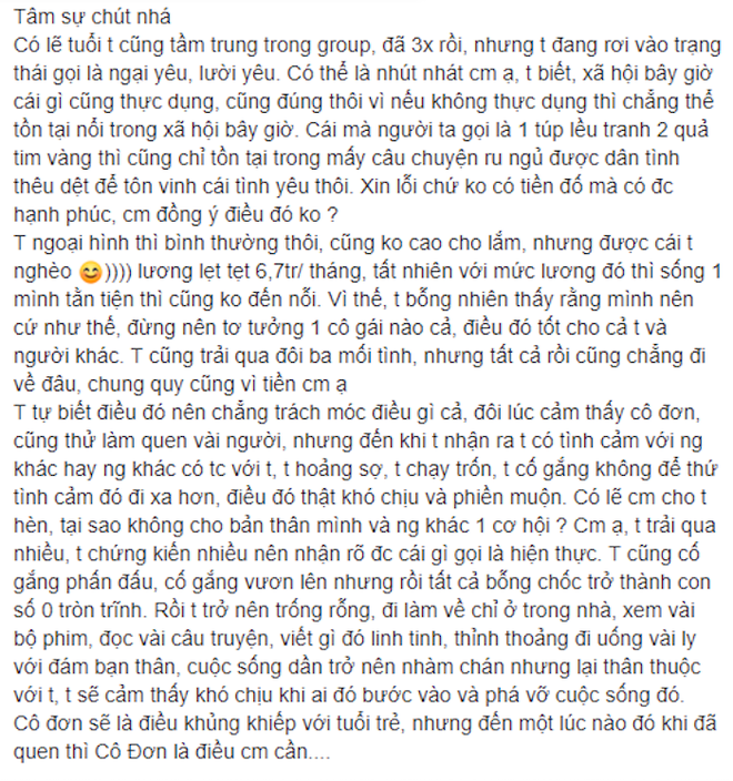 Câu chuyện không chỉ dừng lại ở việc anh đã 30 tuổi mà còn xoáy sâu vào mức thu nhập hàng tháng không đủ để anh này có thể tự tin đến với một ai.