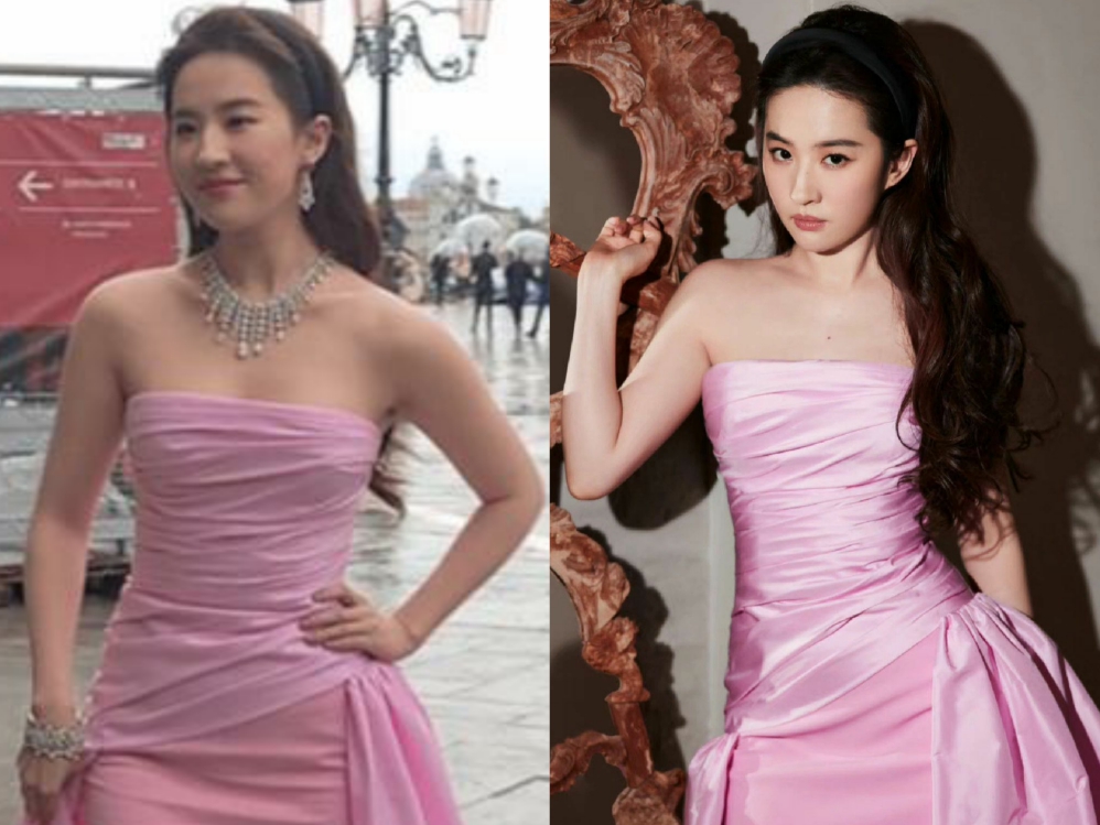 So với hình studio (bên phải), gương mặt Lưu Diệc Phi trong ảnh cam thường có phần tròn trịa hơn một chút.