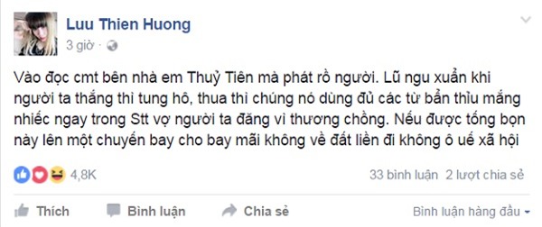 Nguyên văn chia sẻ của Lưu Thiên Hương: "Vào đọc comment bên nhà em Thuỷ Tiên mà phát rồ người. Lũ ngu xuẩn, khi người ta thắng thì tung hô, thua thì chúng nó dùng đủ các từ bẩn thỉu mắng nhiếc ngay trong status vợ người ta đăng vì thương chồng. Nếu được tống bọn này lên một chuyến bay cho bay mãi không về đất liền đi không ô uế xã hội".