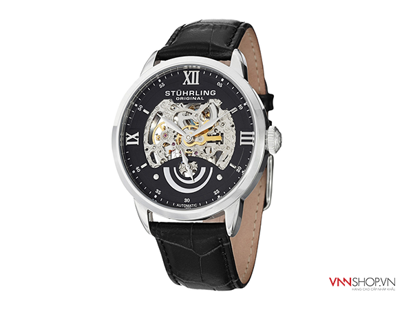 Giới sành đồng hồ cơ lộ máy sẽ nhớ ngay tới thương hiệu Stuhrling. Ảnh: Đồng hồ Stuhrling PK-001029 với mặt đen và dây da cá sấu
