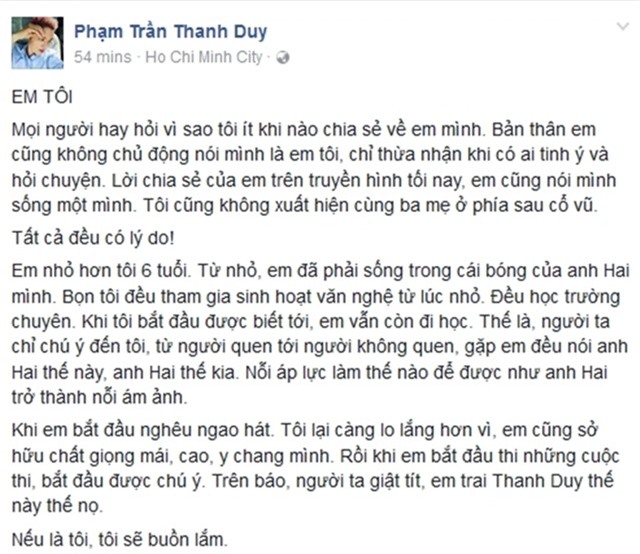 Khi em bắt đầu nghêu ngao hát. Tôi lại càng lo lắng hơn vì, em cũng sở hữu chất giọng mái, cao, y chang mình. Rồi khi em bắt đầu thi những cuộc thi, bắt đầu được chú ý. Trên báo, người ta giật tít, em trai Thanh Duy thế này thế nọ.