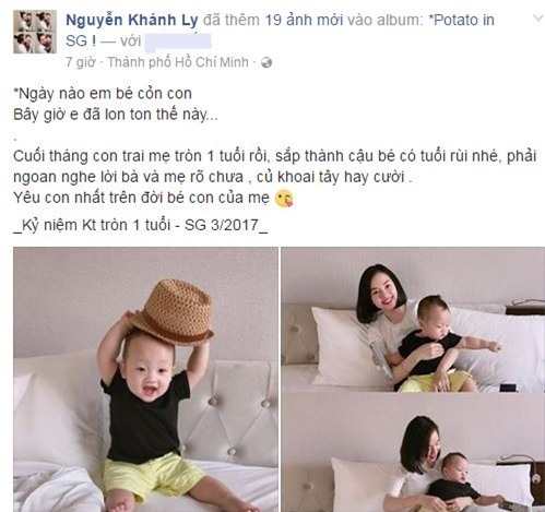 Theo chia sẻ của bà mẹ đơn thân thì, con trai bé nhỏ Khoai Tây sắp thành cậu bé có tuổi, cô hy vọng con lớn sẽ biết nghe lời người lớn - Yêu con nhất trên đời, bé con của mẹ. Theo đúng lịch thì kỷ niệm Khoai Tây tròn 1 tuổi là vào 26/3 sắp tới. Ly Kute hạnh phúc đón con trai chào đời vào ngày 26/3 năm ngoái - 2016.