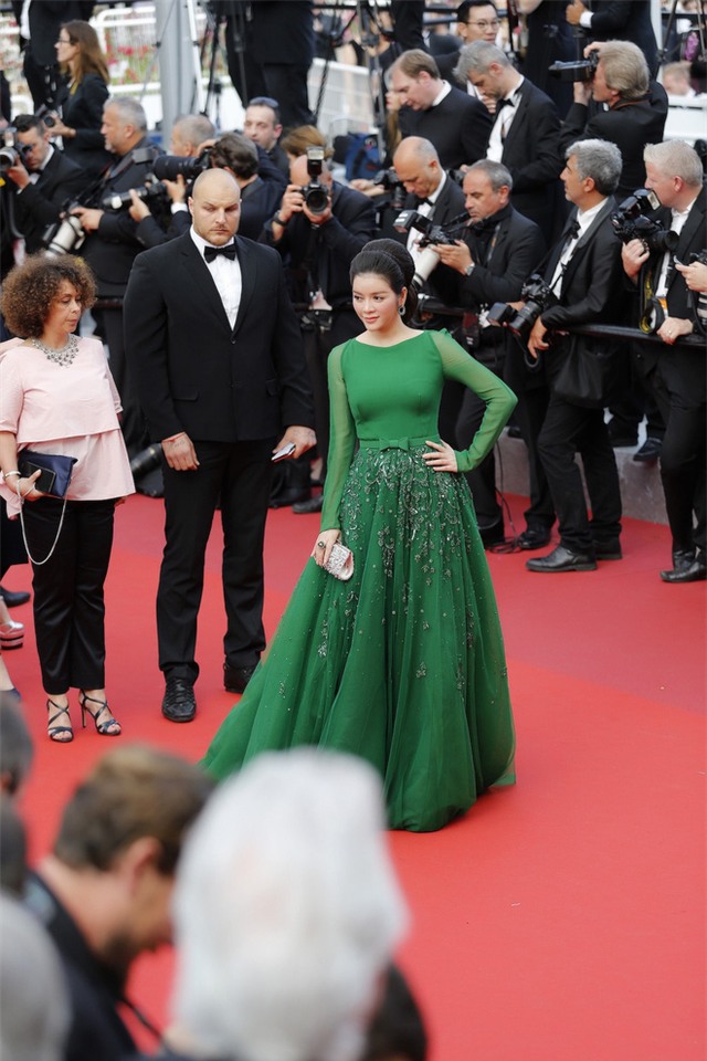 Lý Nhã Kỳ nổi bật với đầm màu xanh lá thuộc dòng haute couture của thương hiệu Georges Hobeika