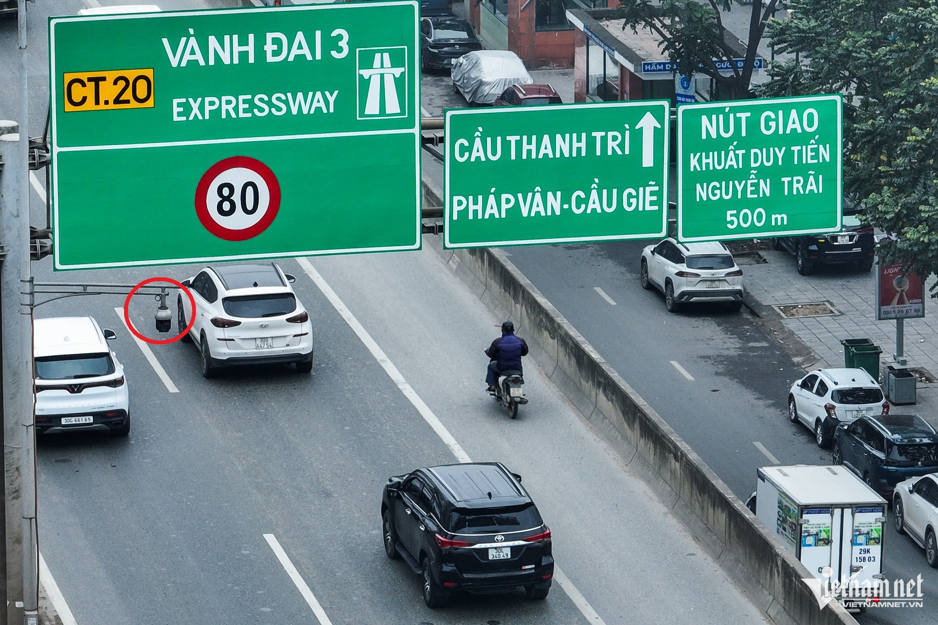 Camera phạt nguội được lắp ngay dưới gầm của đường Vành đai 3 trên cao khi khu vực ngã tư Nguyễn Trãi - Khuất Duy Tiến - Nguyễn Xiển thí điểm phân luồng giao thông theo hướng mới.