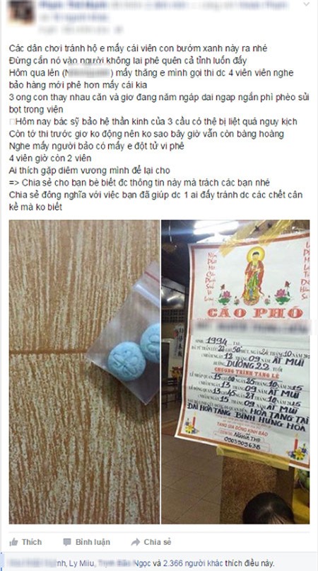 Trong khi một thanh niên Hà thành tên P.T.M cũng cảnh báo về sự nguy hiểm của 'bướm xanh': "Các dân chơi tránh hộ em mấy cái viên con bướm xanh ra nhé! Hôm qua lên bar, mấy thằng em mình gọi thì được 4 viên, nghe bảo hàng mới phê hơn mấy cái kia. 3 ông con thay nhau cắn và giờ đang nằm ngáp dài ngáp ngắn, phì phèo sủi bọt trong bệnh viện.