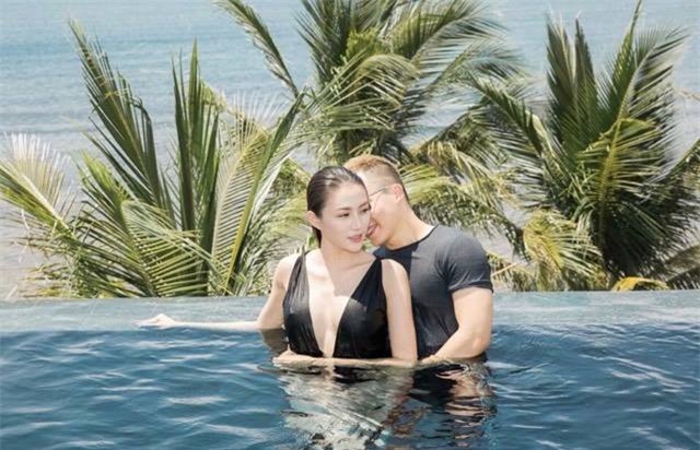 Bức ảnh tình tứ bên ông bầu Vũ Khắc Tiệp gây xôn xao khi Lê Hà để hằn rõ nhũ hoa trong thiết kế áo tắm hở bạo.