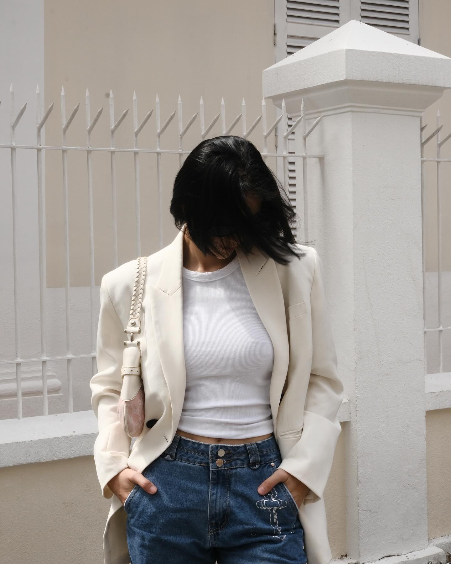 Áo blazer và quần jeans xanh là sự kết hợp không bao giờ sai. Công thức này trẻ trung nhưng vẫn toát lên nét thanh lịch. Tổng thể trang phục càng thêm phóng khoáng và "hack" tuổi hiệu quả nhờ chiếc áo crop top layer bên trong.