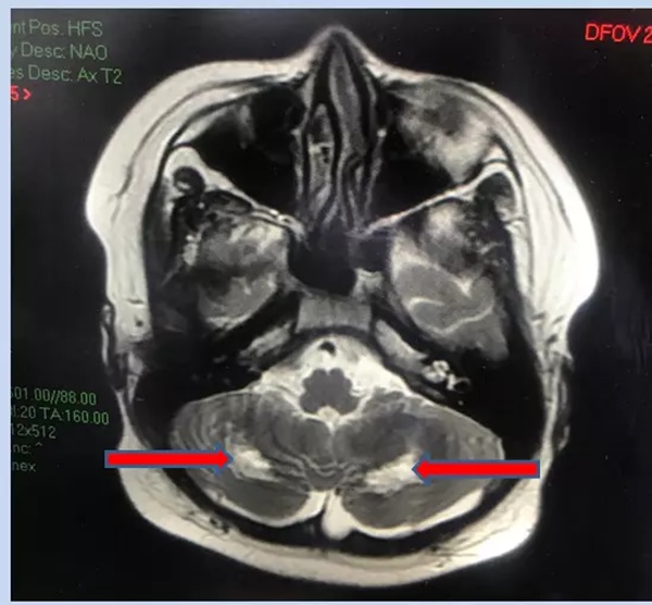 MRI cho thấy tổn thương chất trắng vùng tiểu não 2 bên gây hiện tượng rối loạn phối hợp vận động, loạng choạng ở bệnh nhi.