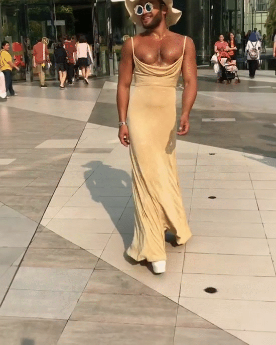 Trong đoạn video, Sinon mặc một chiếc váy Maxim vàng sexy, thậm chí lộ rõ bộ ngực cơ bắp, đầu đội mũ hoa đồng bộ, kèm với đó là một boots trắng vô cùng thời thượng. Anh chàng thể hiện trình độ catwalk đẳng cấp không thua bất cứ một siêu mẫu nào, đồng thời khoe rõ được cơ thể cơ bắp, dẻo dai cùng làn da đen bóng, mặn mà của mình, bất chấp những ánh nhìn tò mò, hiếu kỳ hay kinh ngạc từ những người xung quanh.