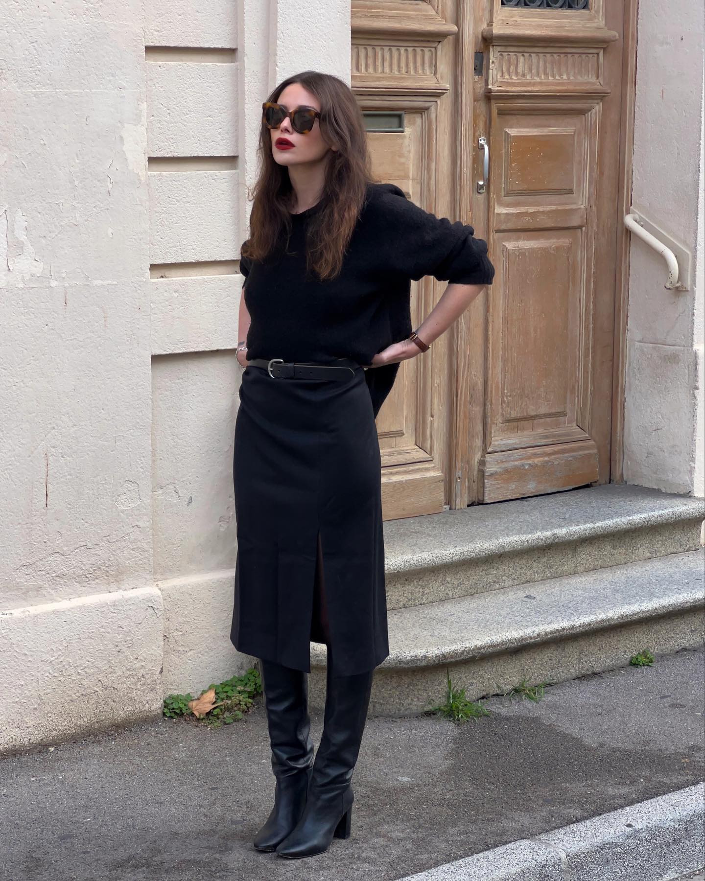 Ngay cả một set chân váy dài toàn tông màu đen cũng có thể mang đến cho người diện sự nổi bật, sang trọng, như outfit trên là ví dụ. Thiết kế chân váy xẻ tà giúp bộ đồ thêm bắt mắt, đồng thời tôn dáng cao ráo, thanh thoát. Thao tác sơ vin và nhấn nhá thắt lưng đã nâng tầm vẻ sang chảnh. Chị em hãy tô son môi đỏ để diện mạo trở nên quyến rũ, lộng lẫy hơn.