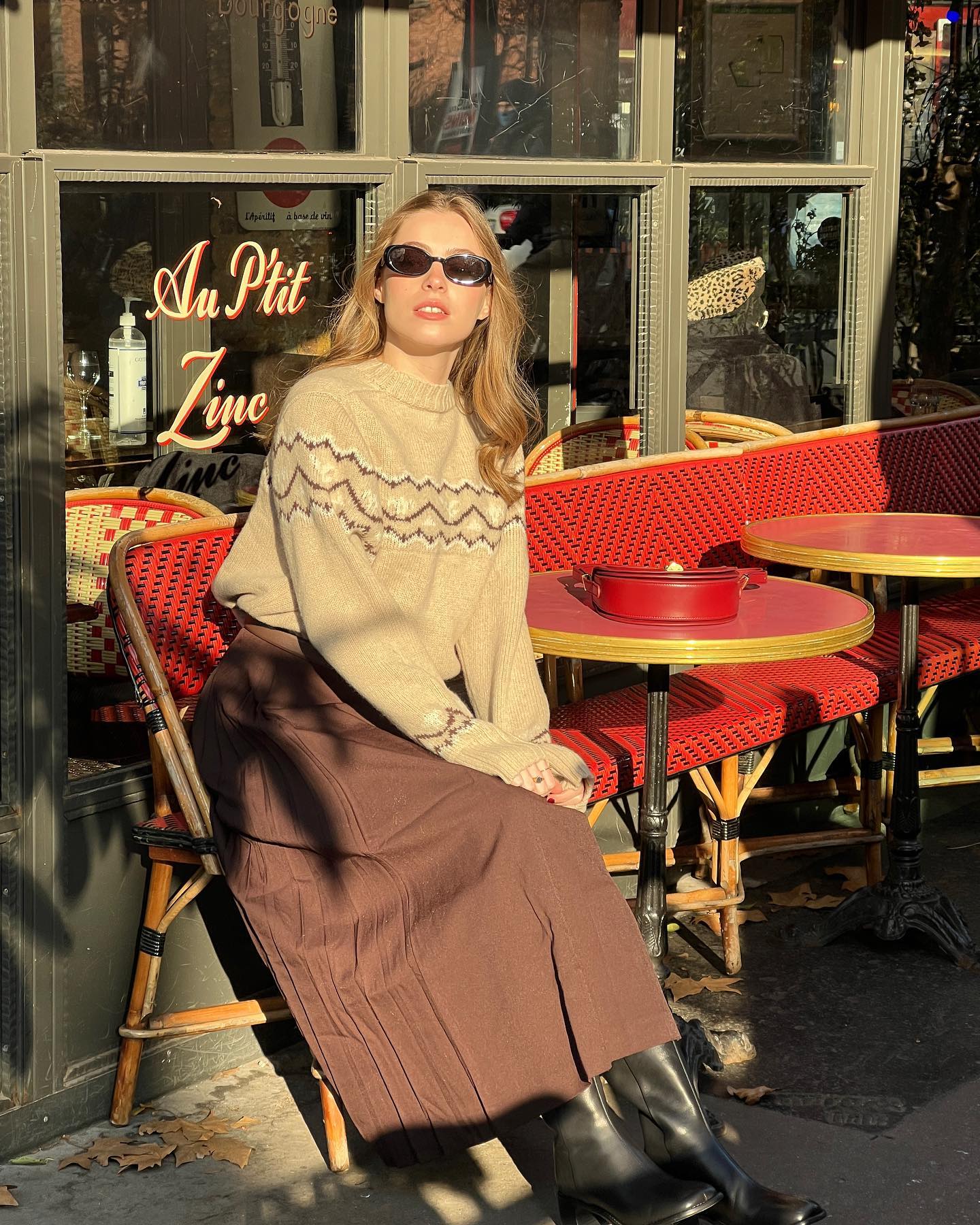 Dù mang tông màu be và nâu làm chủ đạo nhưng set áo len họa tiết + chân váy xếp ly trên đây vẫn rất trẻ trung, nổi bật. Đôi boots đen chính là mảnh ghép hoàn hảo của outfit vì giúp nâng tầm bộ trang phục, đồng thời đảm bảo sự tinh tế.