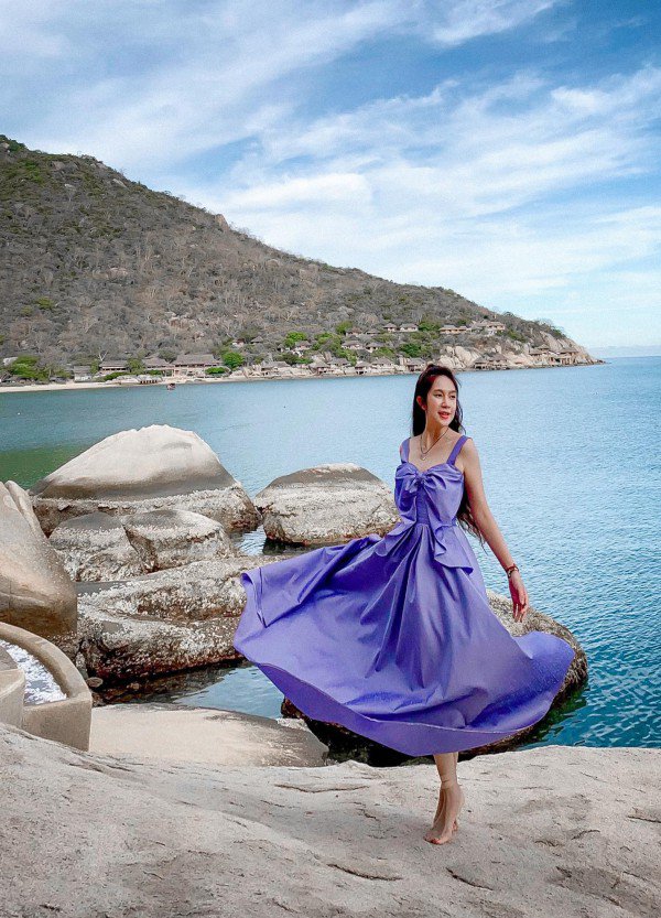 Diện đồ đôi cùng con gái, Minh Hà vô cùng xinh đẹp và nữ tính trong thiết kế đầm xòe màu tím hoa sim.