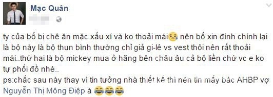 Ngay sau đó, Mạc Hồng Quân đã lên tiếng đính chính. Anh cho biết không có chuyện như nhiều người vẫn tưởng vì đồ anh mua cho con là ở các hãng bên châu Âu và hai vợ chồng không tự ý phối đồ cho con. Kỳ Hân cũng nói thêm ở phần bình luận: "Con trai toàn mặc đồ của các hãng nổi tiếng thế mà chị chê".