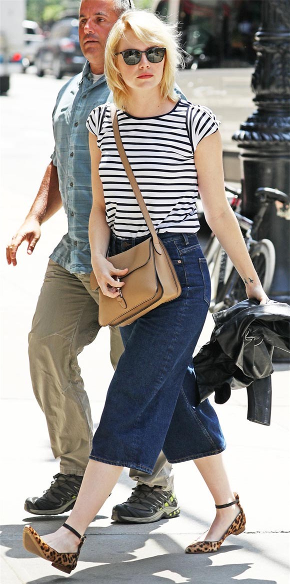 Làm thế nào để mặc jeans và T-shirt chuẩn nhất có thể. Emma Stone mặc một chiếcáo T-shirt sọc ngang, quần culottes denim trẻ trung thoải mái khi vận động với giày Louise et Cie Barry và túi xách Gucci