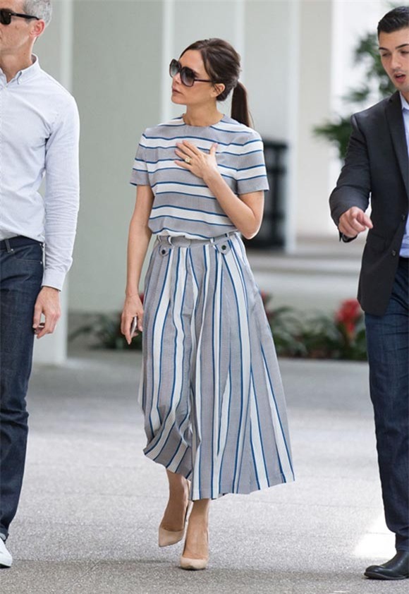 Victoria Beckham tự tin trong một bộ kẻ sọc do chính cô thiết kế