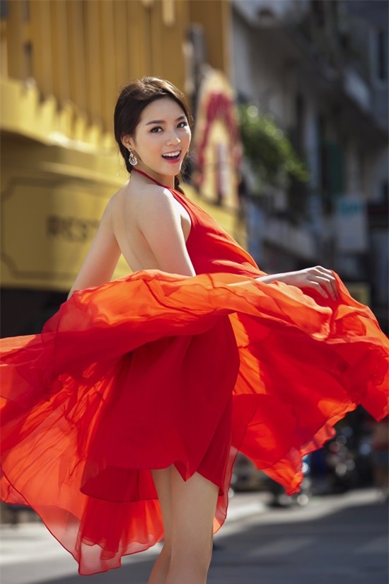 Tân Hoa hậu khoe nét thanh xuân với tông màu đỏ rực.