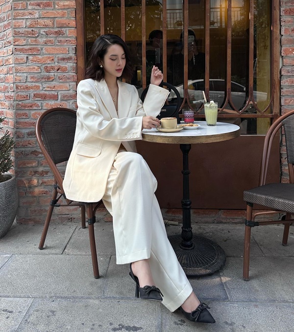 Quỳnh Lương diện quần trắng theo cách rất đơn giản, đó là kết hợp cùng áo blazer đồng bộ. Dẫu vậy, vẻ ngoài của cô vẫn gây ấn tượng ở sự phóng khoáng, thanh lịch. Đôi giày cao gót mũi nhọn có công dụng kéo chân dài, hack dáng và tăng thêm vẻ sang trọng cho outfit.