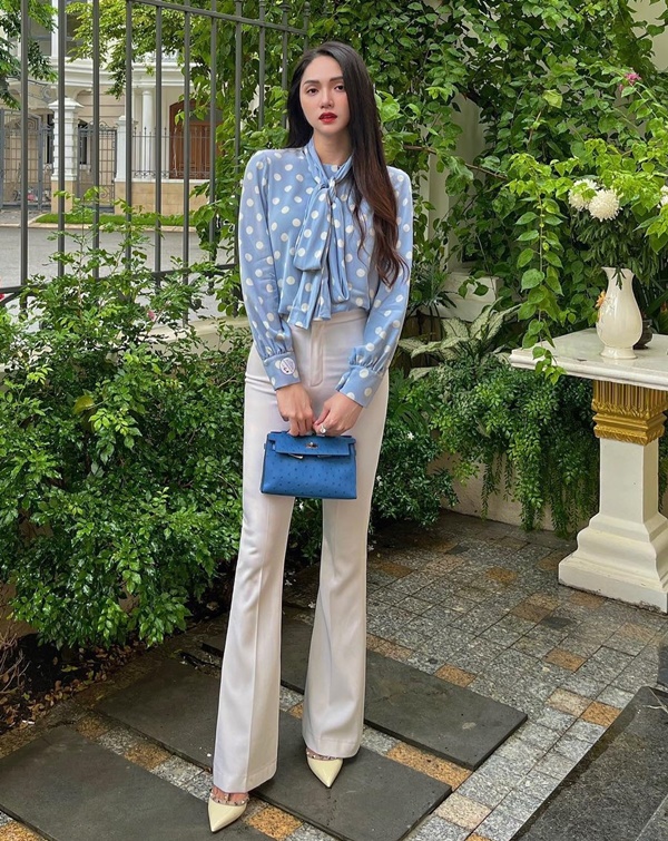 Yêu thích phong cách điệu đà thì chị em đừng bỏ qua công thức áo blouse cổ nơ buộc, kết hợp với quần trắng của Hương Giang. Với tông màu xanh pastel và trắng làm chủ đạo, set đồ này giúp người diện có được vẻ ngoài trẻ trung. Chưa hết, khi chọn quần trắng ống loe và đi giày cao gót mũi nhọn, Hương Giang đã hoàn thiện được outfit kéo chân dài "miên man".