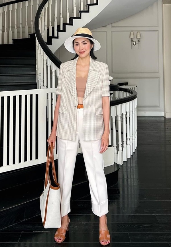 Dù mang tông màu trung tính làm chủ đạo nhưng set đồ của Hà Tăng vẫn có sự phá cách. Bà mẹ ba con kết hợp áo crop top cùng quần âu trắng, khoác ngoài blazer cộc tay. Công thức này tôn lên nét quyến rũ của người mặc, đồng thời đảm bảo sự tinh tế, sang trọng.