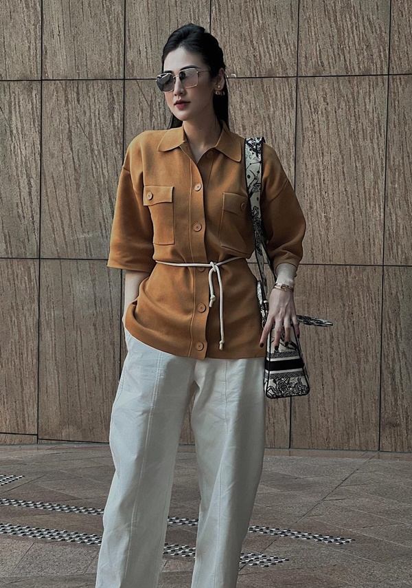 Set đồ của Á hậu Tú Anh có sự đan xen giữa nét phóng khoáng và thanh lịch. Nhờ chọn áo có chi tiết nhấn eo mà người mặc không cần sơ vin, vóc dáng vẫn sẽ được hack tối ưu. Thêm một điểm đáng học hỏi nữa ở set đồ của Á hậu Tú Anh, đó là khi kết hợp áo màu nâu với quần trắng, tổng thể trang phục sẽ không bị cộng tuổi.
