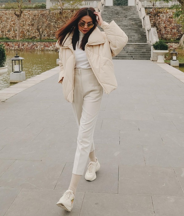 Khi thời tiết chuyển lạnh, chị em có thể học hỏi set đồ toàn tông màu trắng của Phạm Thanh Hằng. Công thức gồm áo phao, áo thun trắng và quần âu của Phạm Thanh Hằng ghi điểm sang xịn mịn. Outfit này cũng không hề cồng kềnh mà khá gọn gàng, tôn dáng.