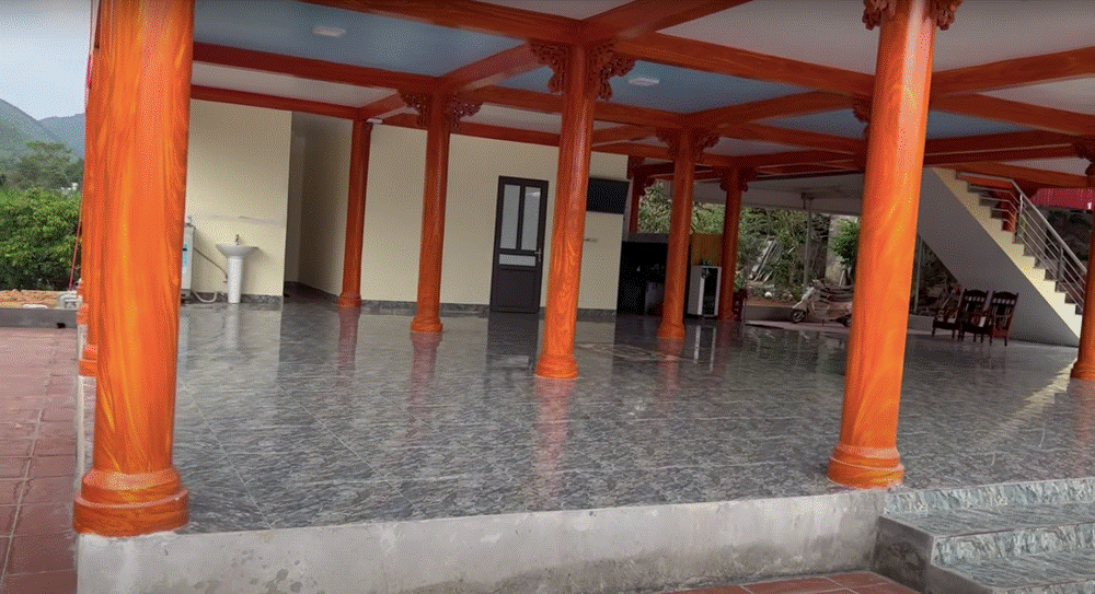 Tầng 1 của căn nhà có diện tích mặt sàn là 170m2, đổ móng hết 33 khối bê tông, gồm 4 phòng trên tầng và 1 phòng ở dưới. Cột nhà làm bằng bê tông và sơn giả gỗ.