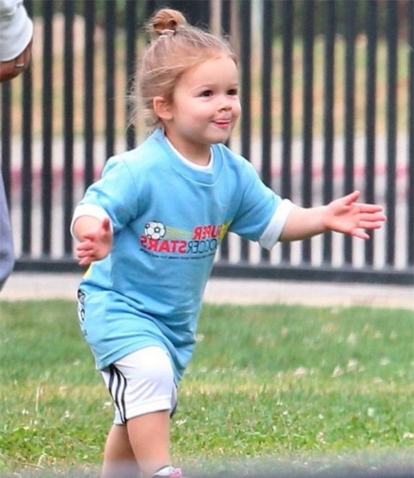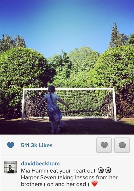 “Mia Hamm đã chiếm trái tim của con bé. Harper Seven đang học chơi bóng cùng các anh (và cả bố nữa)”- Beckham chia sẻ kèm theo bức ảnh Harper Seven tết tóc đuôi sam, đang sút trái bóng vào lưới để ghi bàn. Mia Hamm là nữ cầu thủ nổi tiếng của Mỹ, phải chăng Becks cũng muốn con gái mình theo nghiệp quần đùi áo số?