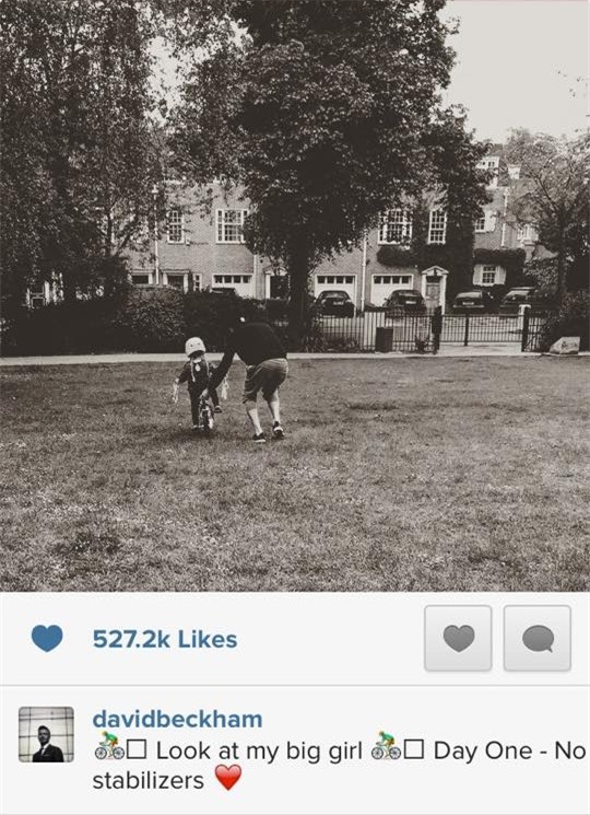 Kể từ khi dùng mạng xã hội Instagram, Beckham không ít lần chia sẻ những khoảnh khắc đáng yêu của cô con gái cưng. Mới đây, cựu thủ quân ĐT Anh cũng khoe tấm hình Harper Seven đang tập xe ở vườn nhà với dòng chú thích: “Hãy nhìn cục cưng của tôi này. Ngày đầu tiên không cần bánh xe giữ thăng bằng nhé.”