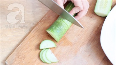 ![]() | ![]() Cắt dưa leo làm đôi, thái lát thật mỏng. |
