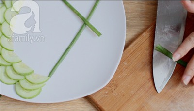 ![]() Sắp lát dưa leo thành hình vòng cung. Lắp lại thành 2-3 hàng dưa leo như vậy. |