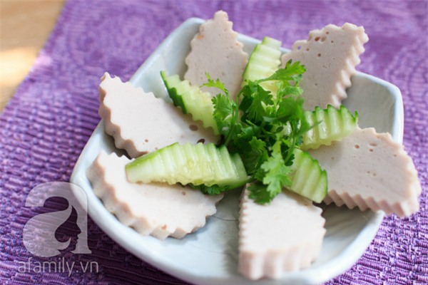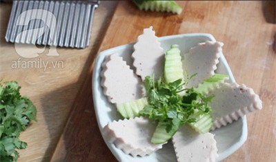 giò hình bán nguyệt, lát mỏng. Cuốn lại tạo thành bông hoa (dùng ly nhỏ