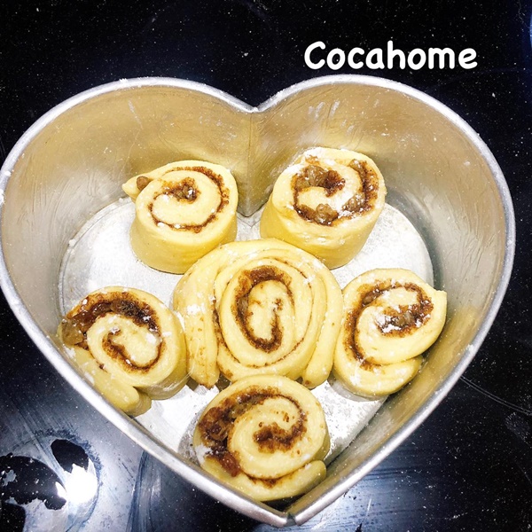 - Đun cách thuỷ 20gram bơ còn lại và quết vào mặt bột. Tiếp tục rải phần đường nâu trộn bột quế lên và rắc phần nho đã ngâm nở vào.