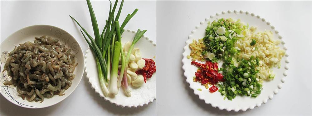 Tôm rửa sạch, cắt bỏ râu và chân tôm. Tỏi bóc vỏ băm nhỏ, tỏi tây và hành thái nhỏ, gừng băm nhỏ, ớt khô cắt khúc.