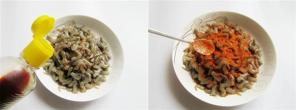 Ướp tôm với rượu, nước tương, hạt tiêu, muối. Thêm ớt bột vào trộn chung.