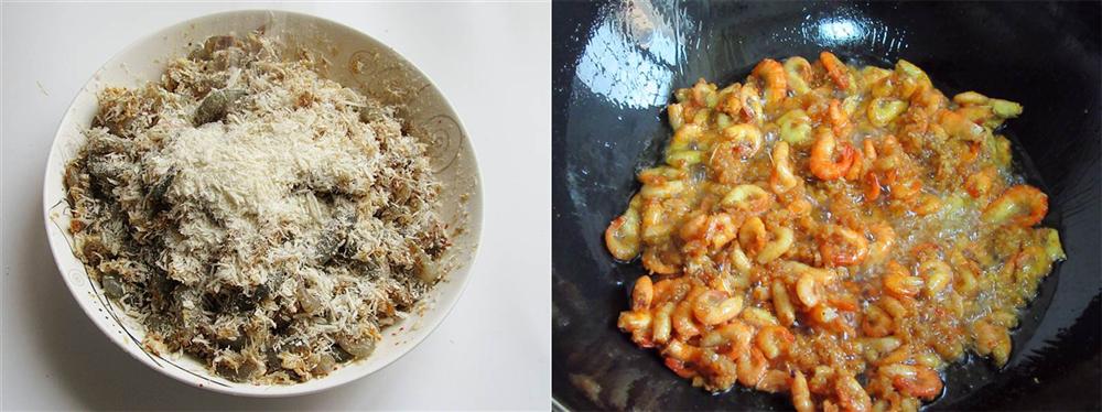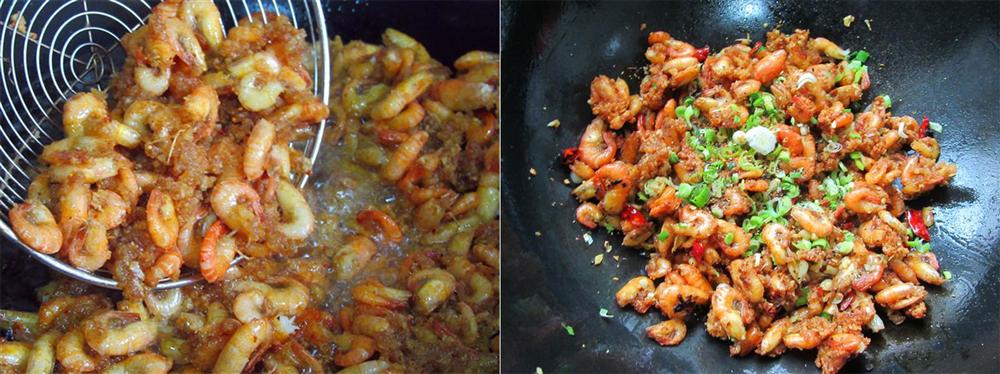 Vớt tôm ra khỏi chảo, đổ phần dầu thừa ra bát rồi trút tôm trở lại chảo, thêm tỏi băm, gừng, hạt tiêu, ớt khô vào đảo đều cho tới khi dậy mùi thơm thì thêm hành lá và tỏi tây vào đảo đều rồi tắt bếp.
