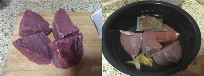 Thịt bò cắt miếng to vừa phải. Cho thịt bò vào nồi thêm phần gia vị vào.
