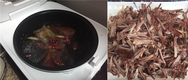 Thêm vài quả ớt khô vào và luộc chín thịt bò. Lấy thịt bò ra để nguội bớt rồi xé sợi.