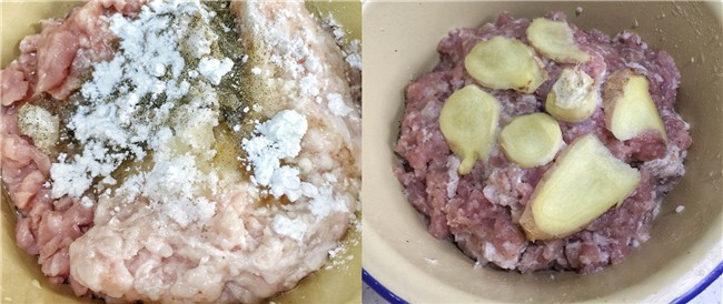 Thịt rửa sạch, xay riêng từng phần thịt nạc và mỡ. Cho thịt vào âu, thêm bột mì, hạt tiêu, bột ớt, đường, muối, mật ong, bột ngọt trộn đều. Thêm từ từ 40g nước vào trộn chung. Thịt sau khi được trộn đều bạn đặt lên trên âu thịt vài lát gừng rồi dùng màng bọc thực phẩm bọc kín lại. Đặt âu thịt vào trong ngăn mát tủ lạnh khoảng 6 giờ.