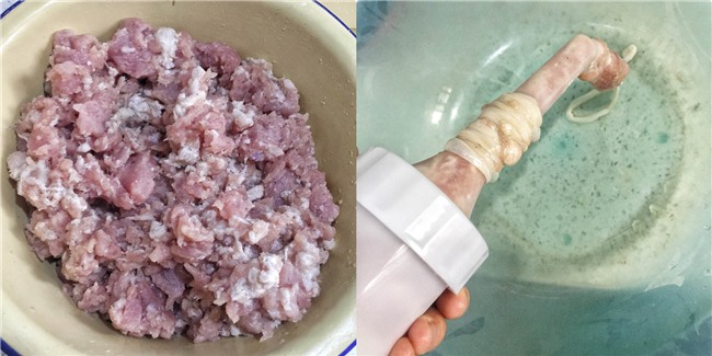 Thịt sau khi lấy từ tủ lạnh ra bạn trộn đều lại thịt một lần nữa, sau đó nhồi thịt vào lòng lợn.