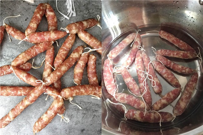 Sau khi nhồi thịt vào lòng, bạn dùng dây buộc vào thành từng đoạn. Bạn dùng tăm chọc 7 đến 8 lỗ trên từng chiếc lạp xưởng để thoát hơi sau đó đem đi phơi khô vỏ lạp xưởng. Sau khi phơi khô bạn bảo quản lạp xưởng để dùng dần. Khi ăn thì cho lạp xưởng vào nồi nước đun nhỏ lửa cho đến khi bọt trắng xuất hiện thì vớt ra để nguội.