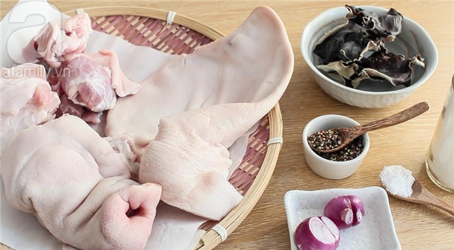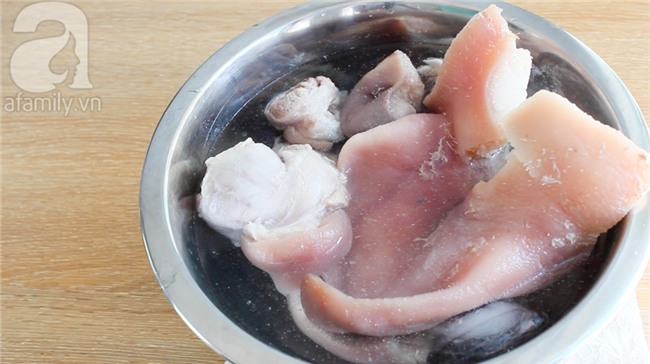 Thịt rửa sạch, luộc trong nồi nước với 1 thìa café muối. Khoảng 20-25 phút sau, dùng đũa xiên thử, nếu xiên vào dễ nhưng rút ra hơi khó là thịt được.
