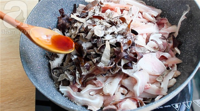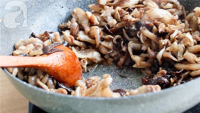 Làm nóng dầu trong chảo, phi thơm hành tím, cho tất cả thịt, mộc nhĩ vào xào. Cho gia vị vào: