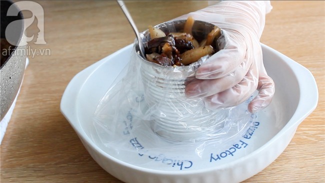 Đặt túi nylon vào lon sữa, cho thịt giò đã xào vào. Mỗi lớp thịt bạn nhớ dùng muôi nén xuống để thịt được dàn đều. Cho thịt vào đầy qua khỏi miệng lon, quấn bao nylon lại, dùng tay nén xuống, buộc chun miệng túi lại.