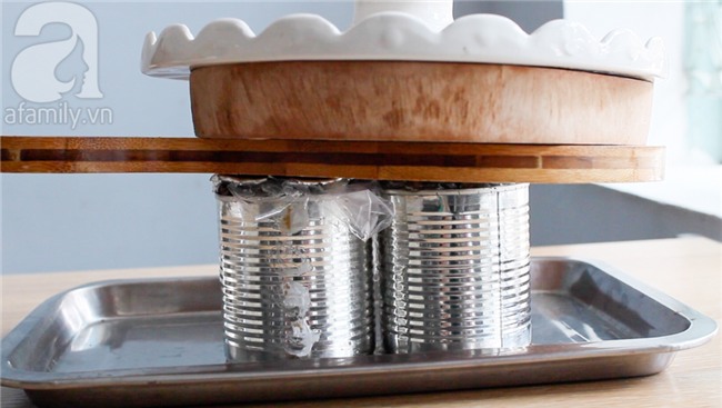 Đặt nắp lon lên, dùng thớt và vật nặng đè lên. Giữ cho đến khi giò nguội hoàn toàn, phần mỡ chảy ra bớt trong khoảng 2-3 giờ. Sau đó cho vào tủ lạnh, nhưng bạn vẫn dùng vật nặng đè lên để giò được định hình nhé.