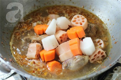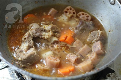 Thêm 2 tô nước vào chảo để ninh sườn cho mềm. Sau 20 phút cho củ sen, cà rốt, củ cải trắng vào