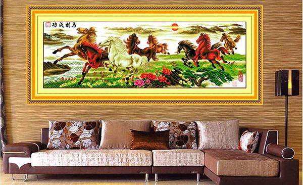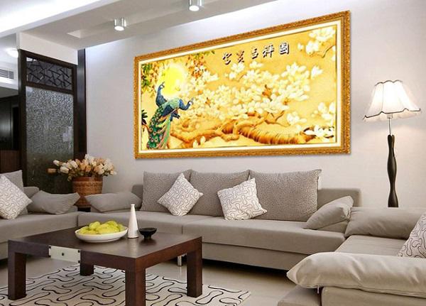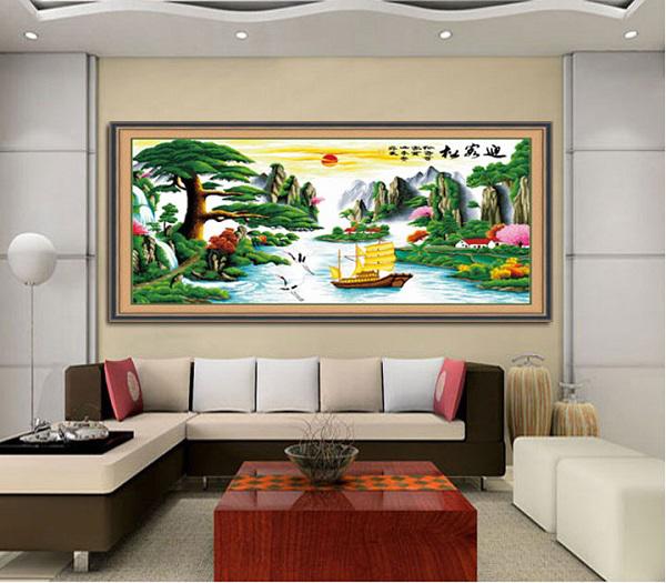 + Phòng khách: Phù hợp treo tranh Mã đáo thành công, hay tranh Thuyền doanh nhân – Thuận buồm xuôi gió, hoặc treo tranh thêu thư pháp với ba chữ Phúc Lộc Thọ
