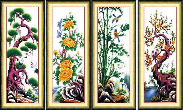 Tranh thêu hình bộ tứ Tùng - cúc - trúc - mai.